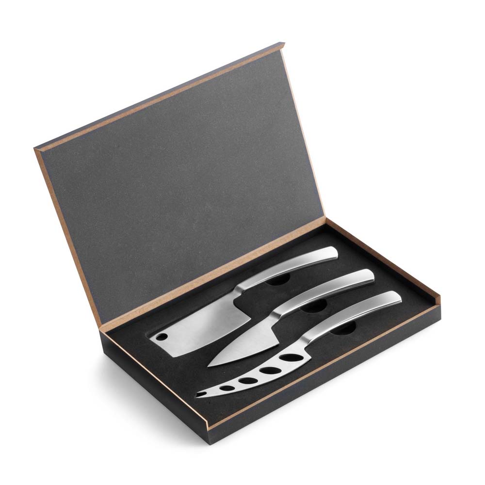 Set cutite personalizate dispuse in cutie confectionata din lemn. Contine 3 cutite personalizate de dimensiuni diferite confectionate din inox. Cutitele au un design modern si sunt un accesoriu nelipsit din bucatarie. Este un produs foarte util in bucatarie care se poate transforma intr-un cadou personalizat deosebit sau poate fi introdus pe lista de obiecte promotionale a evenimentelor sau competitiilor cu tematica culinara. Produs confectionat din lemn si otel inoxidabil. Dimensiuni: 23.6 x 15.3 x 2 cm. Va recomandam personalizarea prin serigrafie, tampografie sau gravura. Costurile de personalizare se calculeaza separat in functie de specificatiile proiectului dvs. Comanda minima 50 buc.