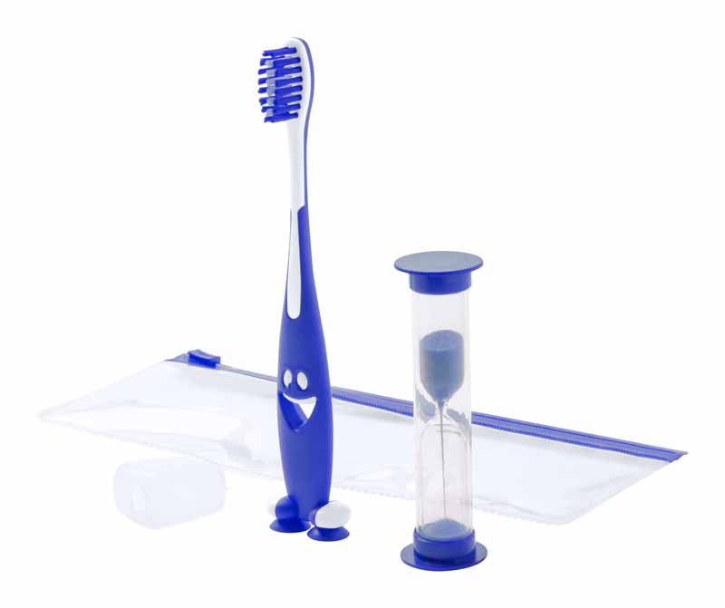 Set personalizat pentru igiena dentara. Este un produs destinat copiilor si cuprinde: periuta de dinti, protectie plastic pentru periuta si clepsidra. Setul personalizat este ambalat in husa transparenta cu fermoar asortat. Baza periutei prezinta ventuze pentru fixare iar corpul acestuia este prevazut cu o fata zambitoare. Este un produs foarte util care prin designul modern ii va atrage si amuza pe copii. Se poate transforma intr-un material promotional deosebit in cadrul campaniilor dedicate copiilor. Produs confectionat din plastic. Culori: galben, rosu, albastru, verde. Dimensiuni: 8 x 20 x 2 cm. Pretul afisat nu include costurile de personalizare. Acestea se calculeaza separat in functie de specificatiile proiectului dvs. Pentru personalizare set va recomandam tampografia sau serigrafia. Comanda minima: 100 buc. Pretul nu include TVA.