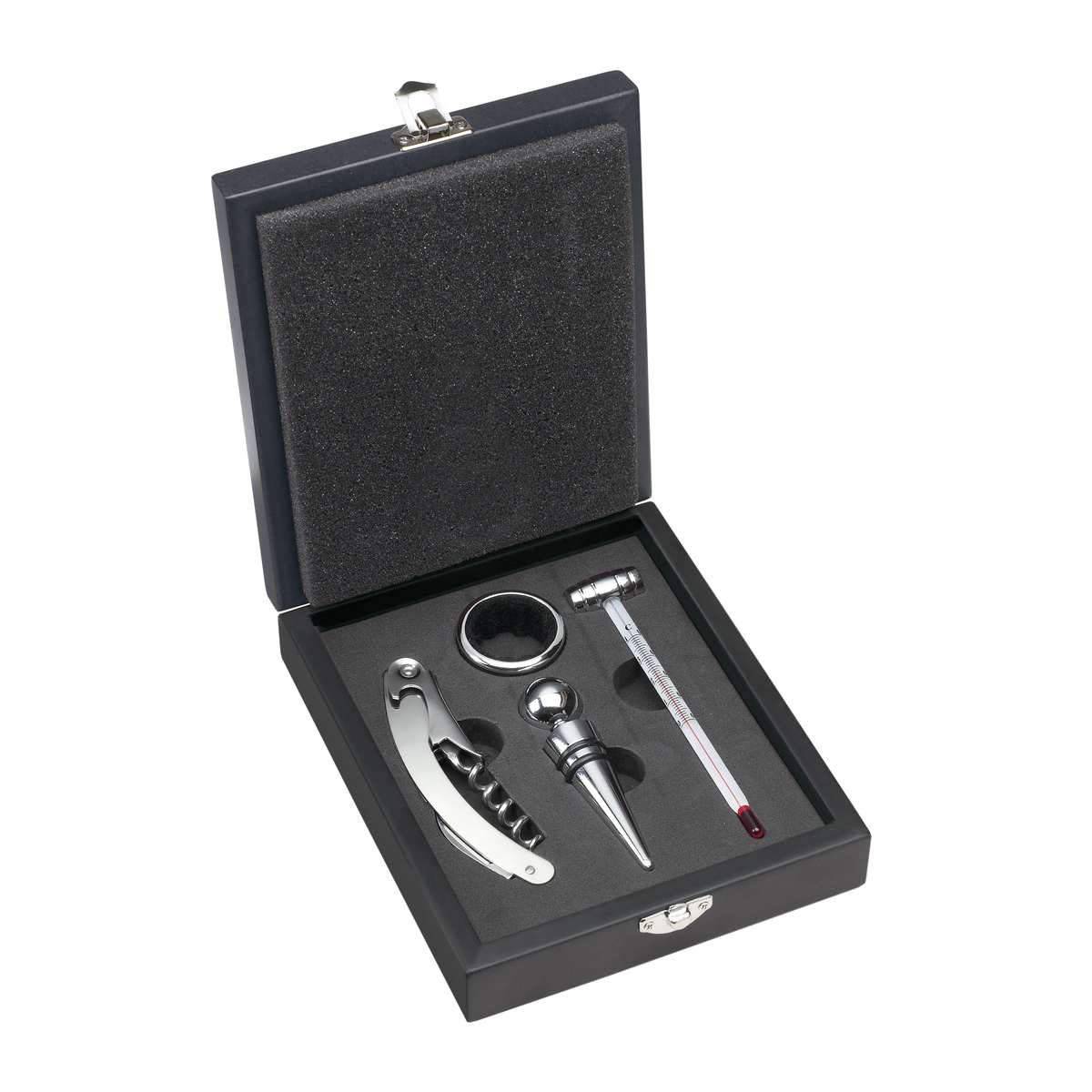 Set personalizat accesorii pentru vin alcatuit din 4 piese metalice: tirbuson, termometru vin, dop sticla si inel antipicurare. Produs livrat in cutie cadou de culoare neagra confectionata din lemn. Dimensiuni ambalat: 192 x 156 x 88 mm. Va recomandam personalizare produs prin tampografie sau gravura. In cazul produselor ambalate in cutie, personalizarea se poate realiza atat pe produse cat si pe cutie. Costurile acestui serviciu se calculeaza separat si variaza in functie de specificatiile produsului dvs. Cantitate minima 50 buc. Pretul nu contine TVA.