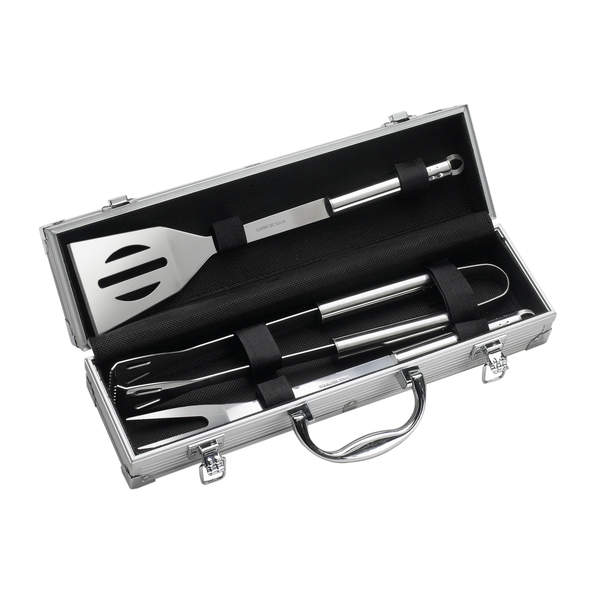 Set personalizat ustensile pentru gratar alcatuit din 3 piese din otel inoxidabil: cleste, paleta si furculita. Setul este ambalat in cutie metalica prevazuta cu incuietoare si maner. Dimensiuni: 370 x 100 x 87 mm. Recomandam personalizare accesorii gratar prin gravura sau serigrafie. Costurile personalizarii se calculeaza separat si variaza in functie de specificatiile proiectului dvs. Cantitate minima 50 buc. Pretul nu contine TVA.