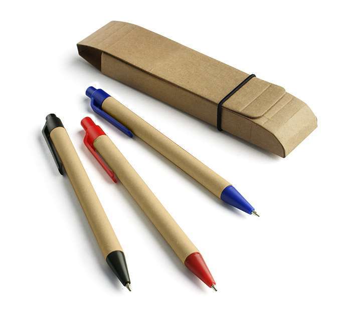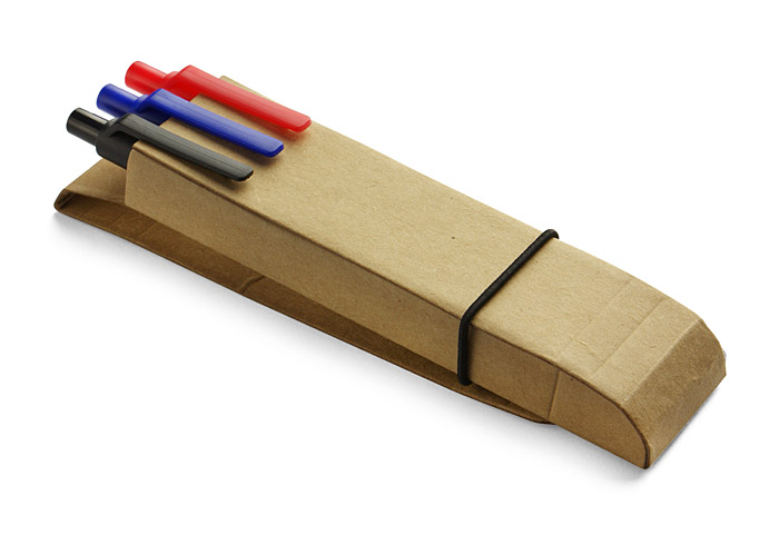 Set personalizat instrumente de scris compus din trei pixuri diferite: albastru, negru si rosu. Produsul este realizat din hartie si plastic. Produsul se livreaza ambalat intr-o cutie de carton prevazuta cu o banda elastica pentru inchidere. Culoare: Bej. Dimensiuni pix: 140 x 10 mm. Dimensiuni cutie: 145 x 32 x 17 mm. Recomandam personalizarea prin serigrafie sau print UV. Costurile acestui serviciu se calculeaza separat in functie de specificatiile clientului. Comanda minima 50 buc. Pretul nu contine TVA.