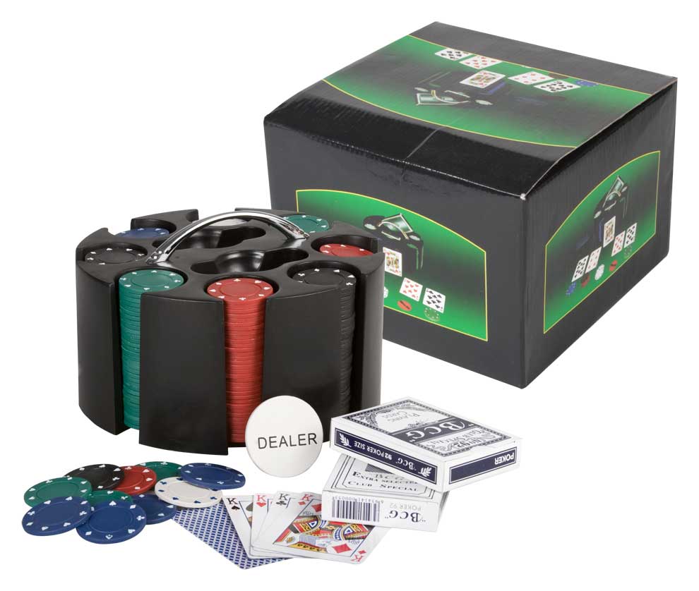 Set personalizat poker cu stativ din plastic si buton pentru pornirea jocului. Setul contine: 2 pachete carti de joc si 240 chipsuri. Dimensiune: diametru 179 x 100 mm. Se recomanda personalizare joc poker prin tampografie sau serigrafie. Costurile de personalizare se calculeaza separat in functie de specificatiile clientului.Cantitate minima 50 buc. Pretul nu contine TVA.