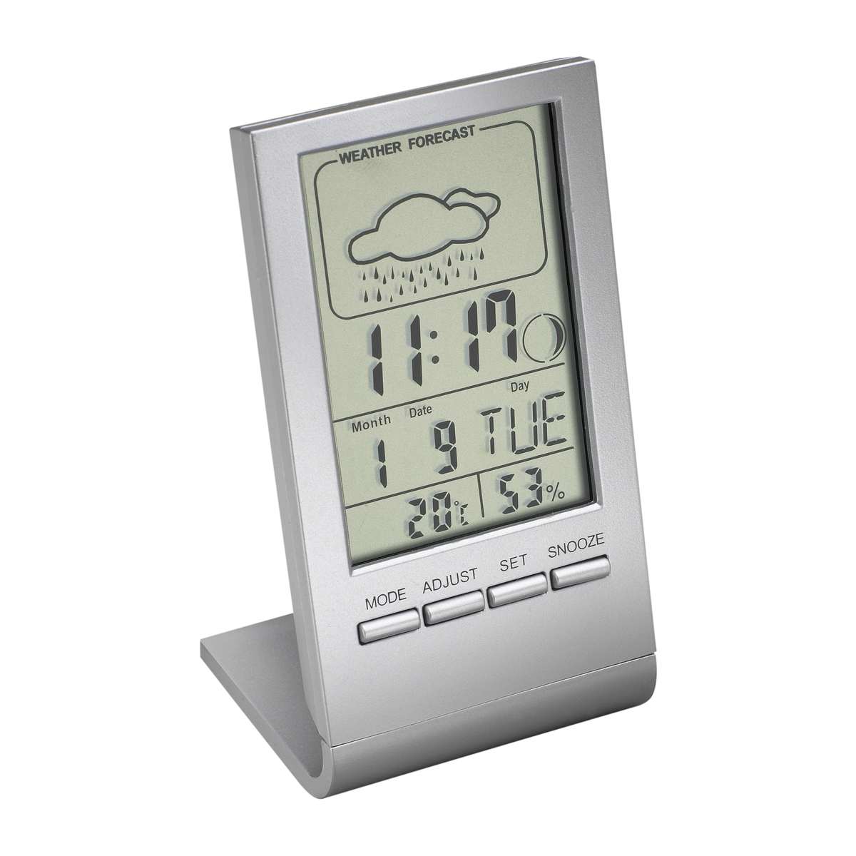 Statie meteo personalizata cu stativ pentru asezarea pe masa/birou. Produs cu afisaj LCD, ceas, alarma cu functie de amanare, termometru, higrometru, calendar (afisaj data si zi calendaristica). Este confectionata din plastic si se livreaza cu baterii incluse in pret. Dimensiuni: 106 x 57 x 51 mm. Va recomandam personalizare statie meteo prin tampografie, serigrafie sau print UV. Costurile acestui serviciu se calculeaza separat in functie de specificatiile proiectului dvs. Cantitate minima 50 buc. Pretul nu contine TVA.