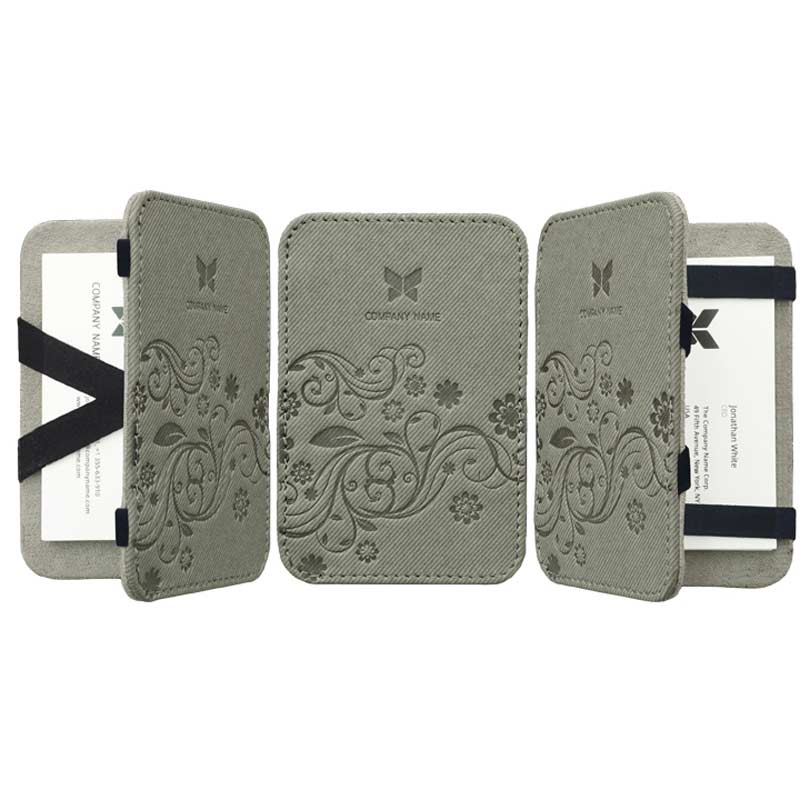 Suport carti de vizita personalizat cu design modern. La interior este prevazut cu benzi elastice pentru fixarea cartilor de vizita. Permite depozitarea a 20 de carti de vizita. Este un produs deosebit care poate reprezinta o optiune potrivita pentru un cadou corporate personalizat pentru partenerii, clientii sau colaboratorii tai. Produs confectionat din piele ecologica. Culori elastic: gri, negru, albastru deschis, verde, albastru, mov, rosu, galben, portocaliu. Dimensiuni: 7 x 10.5 cm. Va recomandam personalizare suport carti de vizita prin embosare. Costurile de personalizare se calculeaza separat in functie de siglele si textele dorite. Comanda minima 50 buc.