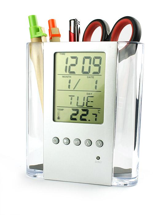 Suport personalizat pentru instrumente de scris prevazut cu ceas digital cu functii multiple (ceas, alarma, termometru, calendar). Produs confectionat din plastic mat si transparent. Dimensiuni: 119 x 104 x 53 mm. Va recomandam personalizarea prin tampografie. Costurile serviciului de personalizare se calculeaza separat in functie de specificatiile proiectului dvs. Comanda minima 50 buc. Pretul nu contine TVA.