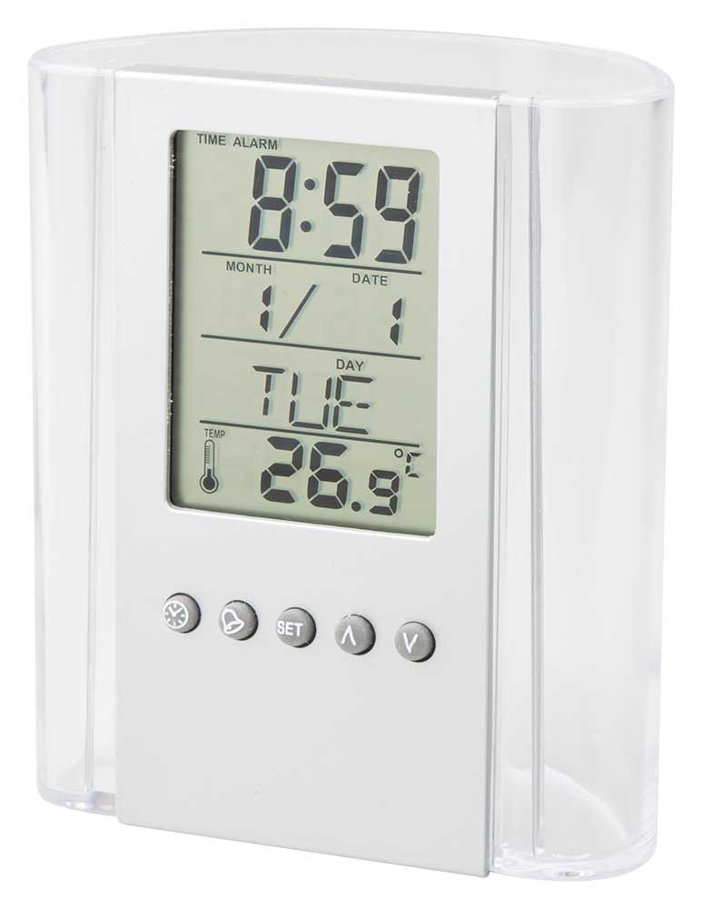 Suport pixuri imprimat pentru birou prevazut cu display digital cu functiile de: ceas, termometru si calendar. Produsul este confectionat din plastic transparent si se livreaza cu baterii. Dimensiuni: 100 x 120 x 53 mm.Va recomandam personalizarea prin tampografie, serigrafie sau print uv. Costurile pentru personalizare se calculeaza separat in functie de cerintele clientului.Cantitate minima 50 buc. Pretul nu contine TVA.