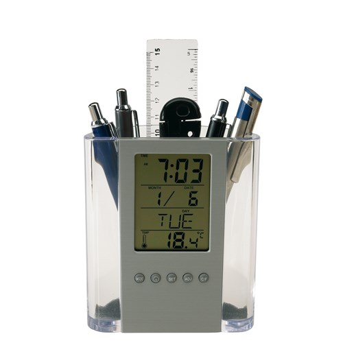 Suport de pixuri personalizat cu ceas incorporat. Ceasul este prevazut cu display digital, alarma, calendar, termometru. Partea din fata este confectionata din aluminiu iar cea din spate din plastic transparent. Se livreaza cu baterii incluse in pret si ambalat in cutie cadou. Dimensiuni: 11,8 x 10,4 x 5,3 cm. Va recomandam personalizarea prin gravura laser sau tampografie. Costurile de personalizare se calculeaza separat in functie de cerintele clientului. Comanda minima 50 buc. Pretul nu contine TVA.
