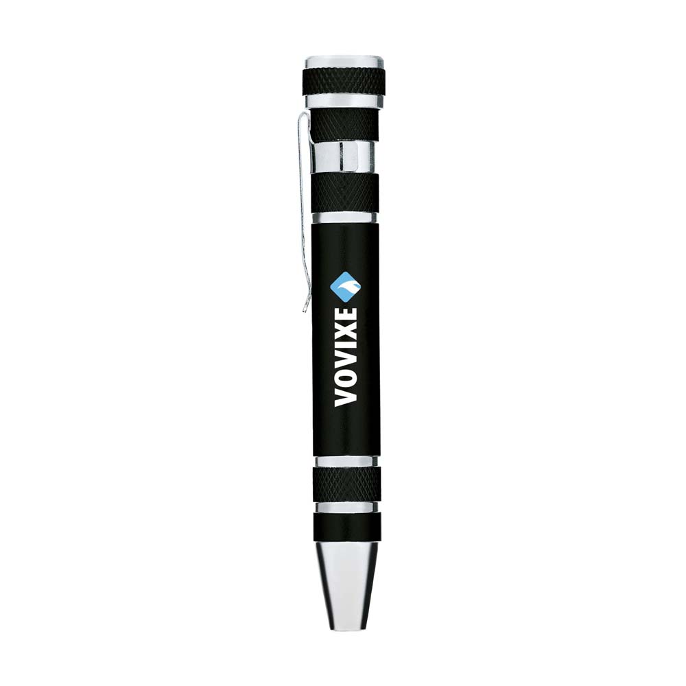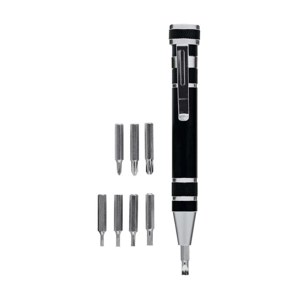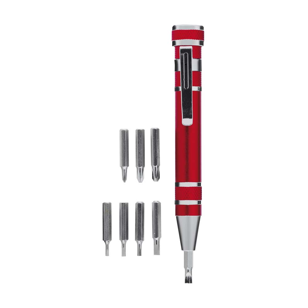 Surubelnita cu 8 capete diferite si design in forma de pix. Este confectionata din aluminiu si este prevazuta cu clips metalic. Are un design compact si este un produs foarte util in gospodarie. Capetele cu care este echipata sunt de dimensiuni si forme diferite care acopera un gama larga de nevoi casnice. Se livreaza ambalat in cutie. Culori: albastru, rosu, negru. Dimensiuni: diametru 1.6 x 11 cm. Va recomandam personalizarea produsului prin tampografie sau gravare laser. Costurile de personalizare se calculeaza separat in functie de detaliile tehnice ale proiectului dvs. Comanda minima 100 buc.