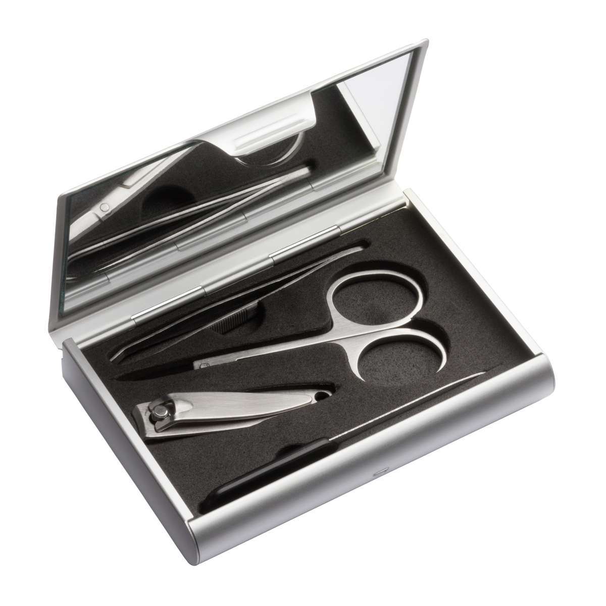 Trusa manichiura personalizata compusa din 4 piese din inox: pila, foarfece, penseta si unghiera. Cele 4 piese ale trusei sunt depozitate intr-o cutie confectionata din metal de foarte buna calitate. Capacul cutiei este prevazut cu oglinda pe partea interioara. Dimensiuni: 107 x 77 x 19 mm. Va recomandam personalizare trusa manichiura prin tampografie sau print UV. Costurile personalizarii se vor calcula separat in functie de cerintele dvs. Cantitate minima 50 buc. Pretul nu contine TVA.