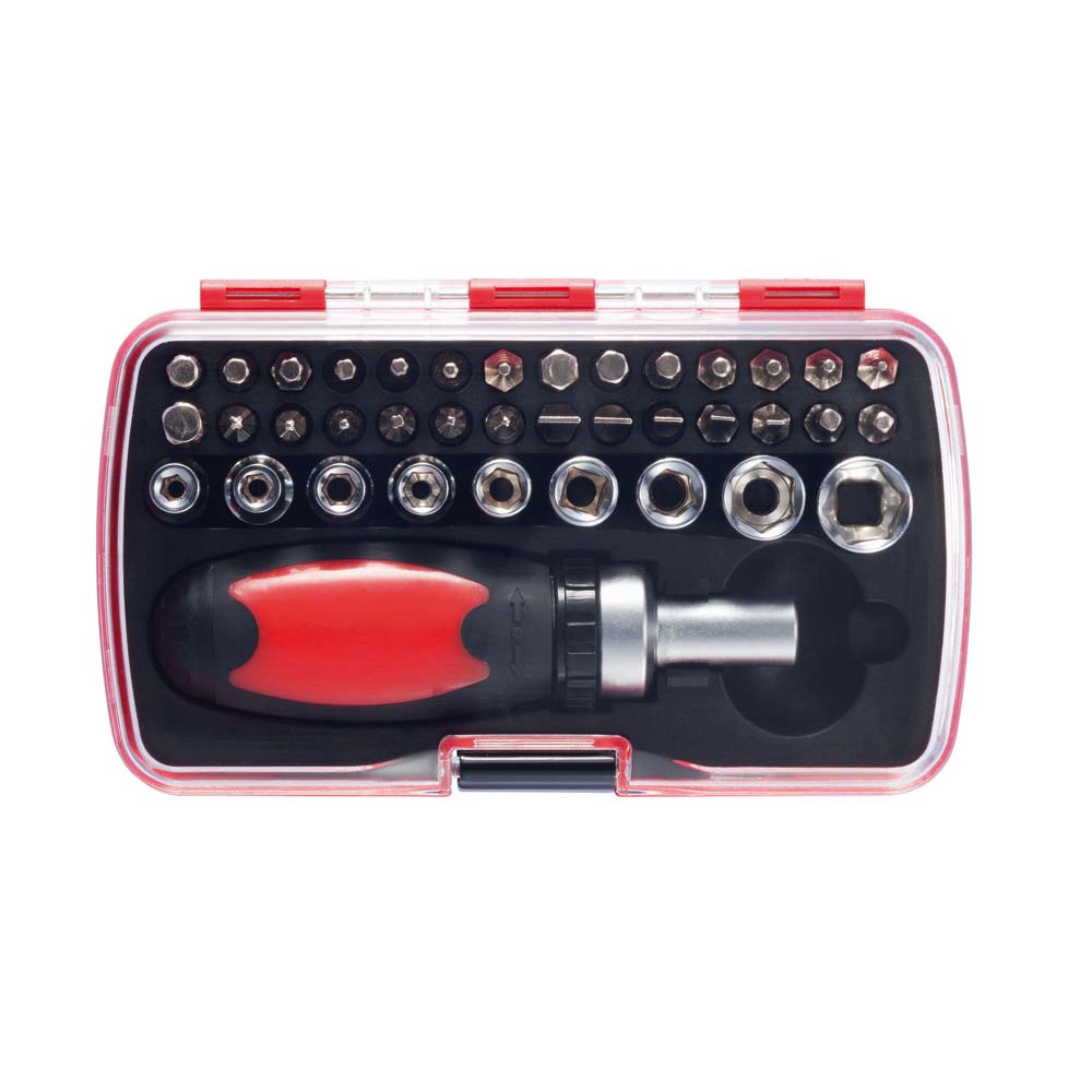 Trusa scule personalizata cu 38 de piese. Include o surubelnita cu maner in doua culori, negru si rosu, 28 de capete diferite pentru surubelnita si 9 capete tubulare de dimensiuni diferite (4, 4.5, 5, 5.5, 6, 7, 8, 10, 12mm). Trusa personalizata este ambalata intr-o cutie asortata prevazuta cu capac transparent. Produs confectionat din otel si policarbonat. Dimensiuni: 14.5 x 8.5 x 3.8 cm. Pentru personalizare produs va recomandam tampografia. Costurile de personalizare se calculeaza separat in functie de specificatiile proiectului dvs. Comanda minima 50 buc.