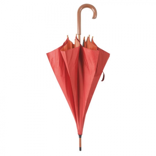 Umbrela personalizata manuala cu maner curbat confectionat din lemn. Se prinde cu banda cu scai iar invelusul este confectionat din poliester 170T. Culori: rosu, albastru, mov, negru, crem, verde, gri, bleumarin, portocaliu. Diametru deschisa: 107 cm. Va recomandam personalizare produsului prin: serigrafie 10*10 cm sau 30*30 cm. Costurile de personalizare se calculeaza separat luandu-se in calcul specificatiile proiectului care se doreste a fi realizat. Comanda minima 50 buc. Pretul nu contine TVA.